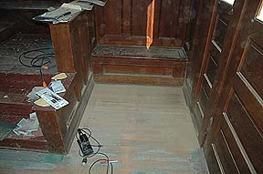 | Cleaned up view of the entryway, a bench seat opens for storage. Going to need a lot of Pledge to get the shine back on the stair rail though. ;-) | Closeup of the bench