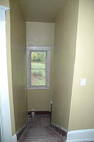 | Minor damage on the corner post, about the only damage in this room! | Paint flecks off the stairwell wall, with very limited/minor cracks in the plaster. |