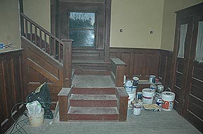 | Excellent condition Entryway doors. Rick's mom told us "If for no other reason, save this door!" | Shot of the stairs & woodwork. This room is in the best condition of the whole house. |