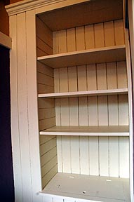 The plaster was too heavily damaged above the built in cabinet, so Kass continued the bead board look above it to tie in with the room! |
