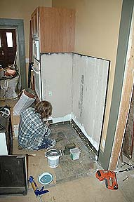 We worked on the wood stove June 4, 2008. Here the wood stove sits on the reconstructed base in front of the heat shield Kass finished last week. Once we finish the flooring we'll complete the stove, and that completes the Kitchen!!! |