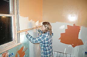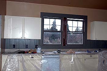| In the background you can see the NEW color for the Kitchen "pumpkin butter", Rick says it looks like his peanutbutter fudge, but he likes it much better than the 1970's "rust" color we originally painted the Kitchen | Kass chose a "butter cream" color for the cabinets. Here, she is painting the inside and the outside of the upper cabinets. Note the lovely fashion habits we follow in the cold weather. :) |