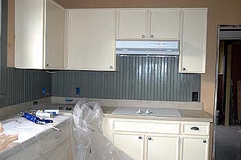 | Here we finally have all the cabinet doors up and painted. Just need the countertops & backsplash! We originally wanted subway tile, but now Kass is having second thoughts. |