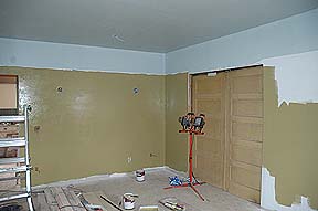 have the pocket doors in the walls repaired above, and then closed to divide off the Living Room & Parlor. Once we had the walls repaired (06-20-2005) we couldn't resist putting the doors back in to see how they looked and worked. They need to be oiled rather badly!!! |