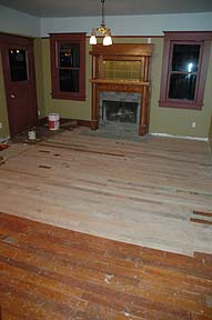 Here you can see the new floor joists going in. We had replaced or sistered in all but two floor joists in the Living Room at this time, and part of the subfloor. |