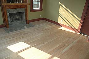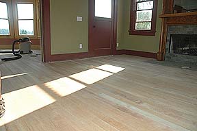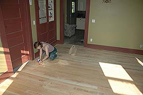 On the wekend of June 21st we tried sanding the floors in the Living Room and Parlor. We started out with a vibrating plate sander and after a day of sanding only got as far as you can see above. We took it back and tried our hand at a drum sander. Left Kass is turning a less than pleased look at Jayden who grabbed the camera (Hey, for once it wasn't me!) as she tries the drum sander out. After a few hours with it we're a little farther along, but far from done. Time will tell if we get finished with it today. |