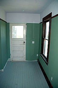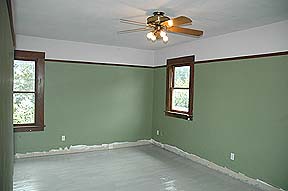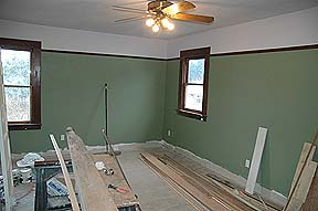 June 15, 2008 Rick and Kass installed the first pieces of base molding in the Master bedroom. We need to get one more long board and the upper molding and this room will be complete. |