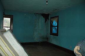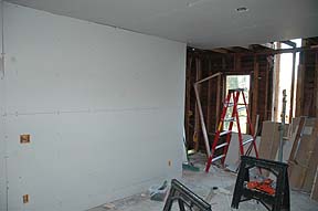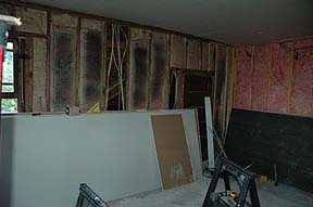 On the weekend of 9-10-2006 we cleaned out and finished up the wall between the Master Bedroom and the Bathroom (left) that ended up having some damage, and Kass' son Rick began running the wires & installing the boxes for outlets, telephone, DSL & TV hookups on the 2nd floor. |
