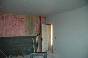 On Father's Day weekend 2007, we finished most of the ceiling and one wall in the Master Bedroom. Above you can see the exterior wall (upper left) and the wall by the Guest Room (upper right). Once we move all the sheet rock stacked against the exterior wall, we can put up the vapor barrier, sheet rock it and the other interior wall. |