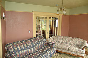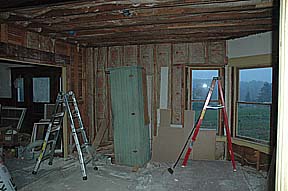 This was the Parlor as we saw it on the first walk through. It looked to be in good shape. One window was missing glass & the paint was peeling off. An exterior wall had water damage and the floor turned out to be damaged as well. |