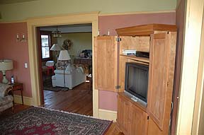 Here you can see the Parlor set up with our TV (Jayden's Cartoon Life Support System) and DVD player. So far it has been pretty comfortable in here watching television, but with all the arranging and moving of things to do, we haven't had much time for it yet. <G> |