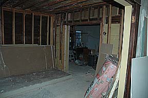 On the weekend of October 10th, 2007, Rick cleaned out a lot of the stuff that had been dumped in the Parlor as we worked on all the other rooms in the house. He had most of the floor cleaned off and all the insulation put up in the ceiling, and a little in the walls as well. Once we put up the sheet rock in here we can start the flooring in here and the Living Room! |