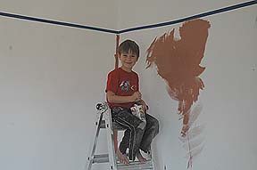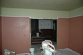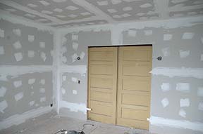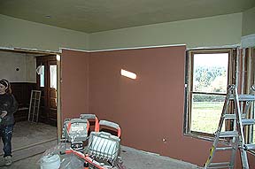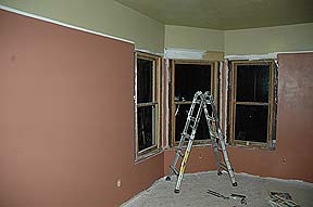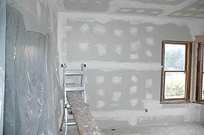 On the weekend of October 20th, Kass finished taping & mudding the Parlor. We had to bring in a heater to get the mud to dry since the rain & temperature dropping was not in our favor. I think she wants to get this room done before the window people come on Thursday to impress them. :) |
