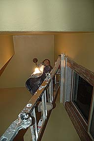 | Minor damage on the corner post, about the only damage in this room! | Paint flecks off the stairwell wall, with very limited/minor cracks in the plaster. |