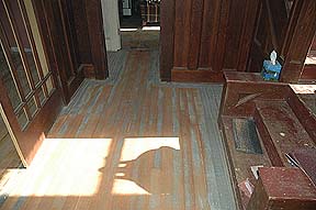 Above Kass works on the Entryway floor with her heat gun. The sanding only took off so much and could not get into this small area very well. Above right the main area was sanded better but still a lot of paint adhered to the floor. Right the smaller section is good to go after Kass' diligent work! |
