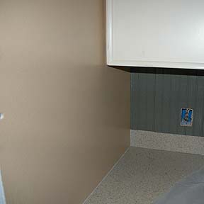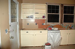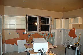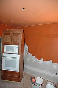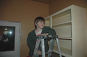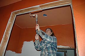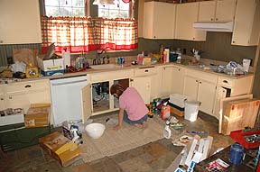 | In the background you can see the NEW color for the Kitchen "pumpkin butter", Rick says it looks like his peanutbutter fudge, but he likes it much better than the 1970's "rust" color we originally painted the Kitchen | Kass chose a "butter cream" color for the cabinets. Here, she is painting the inside and the outside of the upper cabinets. Note the lovely fashion habits we follow in the cold weather. :) |