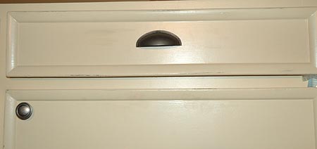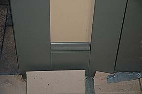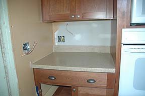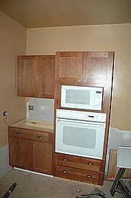 Rick took out the top of the three lower drawers, and used the piece he removed to frame in the opening made above the oven for the microwave. We purchased the cabinet on clearance at the Parr Cabinet Outlet in Hillsboro, OR. Now this whole unit is ready to be installed! |