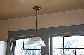 right, but it went in smoothly and no broken glass! Once it was nailed in place, there was nothing left to do but inspect it for fingerprints. <G> We will need to replace two weights and strip the paint off of it, but other than that it's a much needed improvement for the Kitchen! No more rain & wind coming through there. |