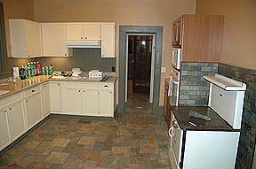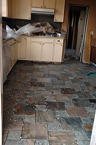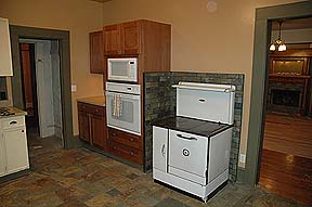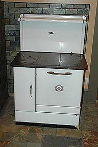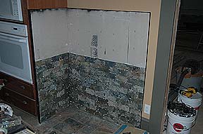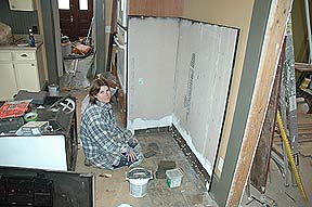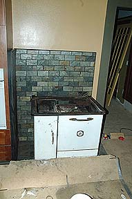 We worked on the wood stove June 4, 2008. Here the wood stove sits on the reconstructed base in front of the heat shield Kass finished last week. Once we finish the flooring we'll complete the stove, and that completes the Kitchen!!! |