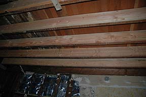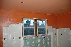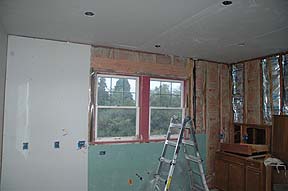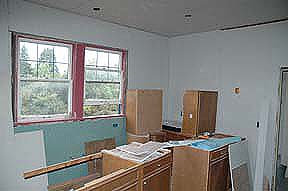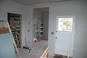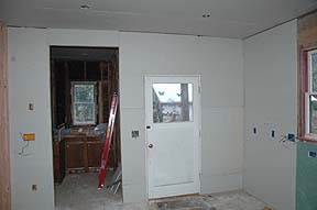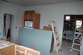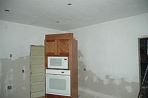 | Here is the new bearing wall (from the Living Room side) to separate the Kitchen from the Living Room. We decided we want one doorway in the wall on the side of the wall by the China Cabinet. | We met with a Kitchen designer to help us decide how to lay out the Kitchen. Here on our finished bearing wall Kass' Grandmother's wood stove will be to the left of the opening. The refrigerator will be in a nook to the right. |