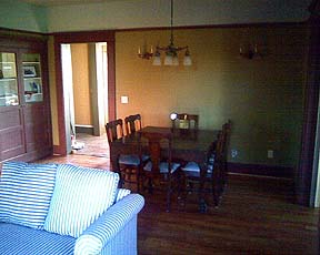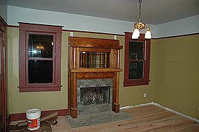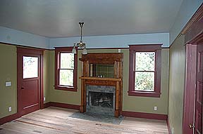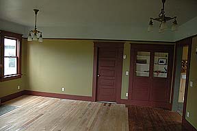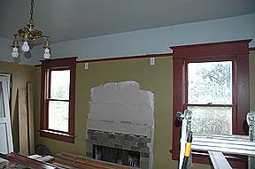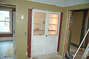have the pocket doors in the walls repaired above, and then closed to divide off the Living Room & Parlor. Once we had the walls repaired (06-20-2005) we couldn't resist putting the doors back in to see how they looked and worked. They need to be oiled rather badly!!! |