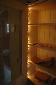 | On Memorial Day Weekend 2008, we completed many tasks in the Living Room. Upper left we built new window sills and headers, and put in the picture rail on the fireplace wall. The mantle should be completed in the next few days. Upper right the re-installed built-in cabinet doors, although one window cracked and we've removed the glass. Kass' son Rick installed some interior lighting for the cabinet (lower left). Lower right the painted doors with trim & header. When we re-built the wall between the Kitchen & Living Room, we made it a bit too close to the Living Room and had to trim down the header & side trim | |