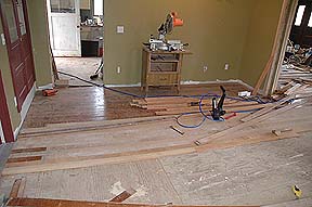 We also managed to kill about nine sawzall blades, and most of the muscles in all four of our bodies! Above Rick & Deb begin tackling the last half of the living room of the Beach House. Our cordless Sawzall batteries couldn't keep up fast enough so we used their Rigid Sawzall. We estimate we recovered about 600 square feet of flooring. We believe this will replace all the Living Room and Parlor flooring. |