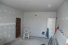 On the weekend of 9-10-2006 we cleaned out and finished up the wall between the Master Bedroom and the Bathroom (left) that ended up having some damage, and Kass' son Rick began running the wires & installing the boxes for outlets, telephone, DSL & TV hookups on the 2nd floor. |