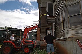 projects. In the upper left corner, a view of the repaired back corner of the Master Bedroom. We had to repair it to complete the roofing over it. Upper right, Kass' friend David Pierce lended a hand cutting the beams & studs we needed. Left is a shot of a bee hive we found in the wall of the Master Bedroom while replacing the rotted 2x4's in the wall. Certainly glad it wasn't an active hive! |