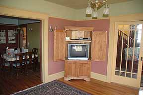 Here you can see the Parlor set up with our TV (Jayden's Cartoon Life Support System) and DVD player. So far it has been pretty comfortable in here watching television, but with all the arranging and moving of things to do, we haven't had much time for it yet. <G> |