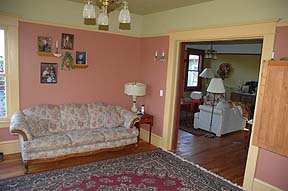This was the Parlor as we saw it on the first walk through. It looked to be in good shape. One window was missing glass & the paint was peeling off. An exterior wall had water damage and the floor turned out to be damaged as well. |