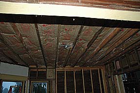 On the weekend of October 10th, 2007, Rick cleaned out a lot of the stuff that had been dumped in the Parlor as we worked on all the other rooms in the house. He had most of the floor cleaned off and all the insulation put up in the ceiling, and a little in the walls as well. Once we put up the sheet rock in here we can start the flooring in here and the Living Room! |