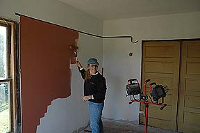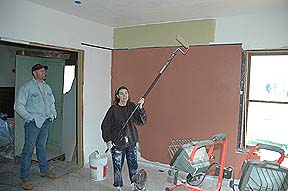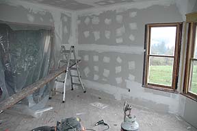 On the weekend of October 20th, Kass finished taping & mudding the Parlor. We had to bring in a heater to get the mud to dry since the rain & temperature dropping was not in our favor. I think she wants to get this room done before the window people come on Thursday to impress them. :) |